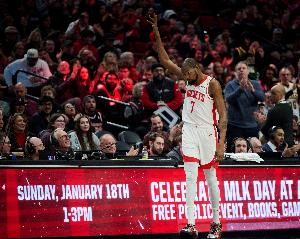 開(kāi)拓者播音員致敬杜蘭特,和杜蘭特握手,開(kāi)拓者現(xiàn)場(chǎng)觀眾鼓掌致敬,KD單手指天回以致意