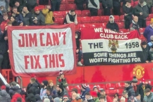 現(xiàn)場的曼聯(lián)球迷打出了兩面橫幅,其一是“吉米(拉特克利夫的名字)解決不了這個(gè)”,另一面橫幅則寫著“我們想要回我們的俱樂部。1958。有些事是值得為之奮戰(zhàn)的?!?/p>