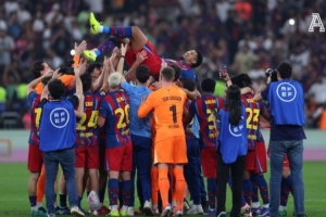 體育資訊1月12日訊 西超杯決賽,巴薩3-2戰(zhàn)勝皇馬。據(jù)The Athletic報(bào)道,阿勞霍在賽后被隊(duì)友拋起慶祝。