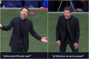 在一次犯規(guī)判罰之后,鏡頭拍到了馬競(jìng)主帥西蒙尼正在對(duì)主裁曼薩諾抗議:“嘿!你在吹什么!冷靜點(diǎn)!就為了這個(gè)出牌?”西蒙尼最后又搖著頭說:“你不敢對(duì)維尼修斯出牌?!比缓笏侄⒅谒墓賳T重復(fù)了一遍這句話。