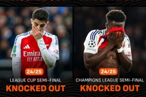 據(jù)Live Score統(tǒng)計,阿森納各項賽事近4次半決賽皆出局,這是該俱樂部歷史上最長的半決賽連續(xù)出局紀錄。