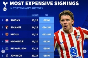 體育資訊1月15日訊 熱刺已經(jīng)官宣簽下馬競中場加拉格爾,《轉(zhuǎn)會市場》也統(tǒng)計了熱刺隊(duì)史引援榜情況,哈維·西蒙斯等4將超過6000萬歐元。