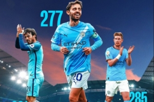 本場(chǎng)比賽也是B席第277次代表曼城在英超出場(chǎng),升至隊(duì)史第三位,僅次于席爾瓦的309場(chǎng)以及德布勞內(nèi)的285場(chǎng)。