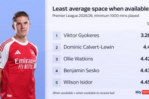 在英超球員持球時(shí)的平均“可行動(dòng)空間”排行榜上,約克雷斯以3.28米的數(shù)據(jù)排名英超最低。