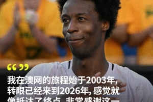 賽后,孟菲爾斯說道:“我在澳網(wǎng)的旅程始于2003年,轉(zhuǎn)眼已經(jīng)來到2026年,感覺就像抵達(dá)了終點。非常感謝這一路精彩的旅程,太不可思議了?!?/p>