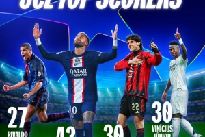 維尼修斯在歐冠中的進(jìn)球數(shù)達(dá)到30球,這讓他追平了卡卡并列巴西球員歐冠進(jìn)球榜次席,位居兩人身前的是打進(jìn)43球的內(nèi)馬爾。