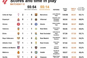 體育資訊11月10日訊 數(shù)據(jù)網(wǎng)站OPTA盤(pán)點(diǎn)了本輪西甲有效時(shí)間榜單,其中巴薩4-2塞爾塔以及比利亞雷亞爾2-0西班牙人的兩場(chǎng)比賽有效時(shí)間超過(guò)65分鐘。