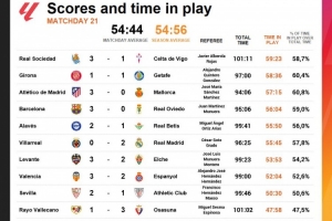 體育資訊1月27日訊 數據顯示,西甲第21輪沒有任何一場比賽的凈時間超過了60分鐘,平均凈時間為54分44秒。