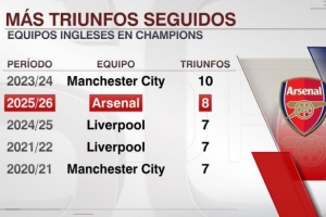 以下為英超球隊(duì)在歐冠連勝紀(jì)錄榜: