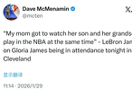 詹姆斯:“我媽媽今天來現(xiàn)場親眼見證了兒子和孫子同時征戰(zhàn)NBA?!?/p>