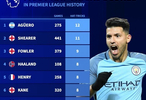北京時間11月11日,德轉統(tǒng)計出了英超歷史完成帽子戲法次數最多的10名球員,阿圭羅以12次排名第一,阿蘭-希勒11次第二,哈蘭德8次位列第四。