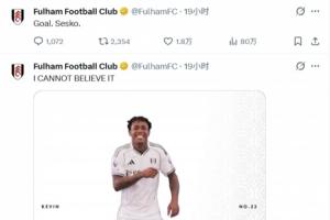 當(dāng)凱文在第91分鐘依靠一記世界波為富勒姆在夢(mèng)劇場(chǎng)扳平比分時(shí),富勒姆官推陷入狂歡,并發(fā)布了一大段的亂碼。在凱文的進(jìn)球賽訊中,官推寫道:“我簡(jiǎn)直不敢相信”。