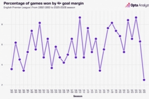 本賽季英超至今,只有2.5%的比賽以至少4個凈勝球的優(yōu)勢獲勝,這是該項賽事歷史上的最低比例。阿森納周六4-0大勝利茲聯(lián),這是本賽季第6場至少凈勝4球的情況,而在2023-24賽季,這樣的勝利出現(xiàn)了33次。