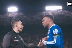 DAZN攝像機拍到姆巴佩上半場結束后與第四官員溝通。