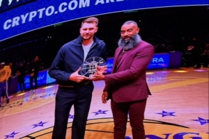 湖人主場(chǎng)迎戰(zhàn)馬刺,賽前東契奇領(lǐng)取了1月的月最佳球員獎(jiǎng)杯。