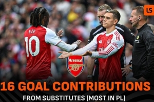 本賽季,阿森納替補(bǔ)球員在英超參與了16個(gè)進(jìn)球,在聯(lián)賽排名第一,而曼城的替補(bǔ)球員只參與2個(gè)進(jìn)球,聯(lián)賽最少。