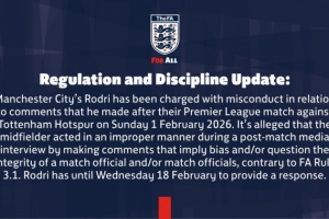 英足總官方寫道:“監(jiān)管與紀(jì)律更新:曼城的羅德里因在2026年2月1日周日對(duì)陣熱刺的英超比賽后發(fā)表的言論,被指控行為不當(dāng)?!?/p>