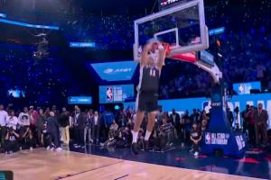卡特·布萊恩特胯下拋球打板連續(xù)失敗,最后換了一個360度普通扣籃,只得43分,無緣冠軍。