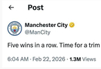 賽后曼城官方社媒玩梗,發(fā)文:“五連勝到手,是時候剪發(fā)了“。隔空調(diào)侃曼聯(lián) “蓄發(fā)哥”—— 這位球迷誓言曼聯(lián)五連勝才剪發(fā),如今曼城先達成成就,官方直接送上 “理發(fā)提醒”。
