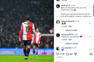 斯特林此役替補(bǔ)出場(chǎng),上演費(fèi)耶諾德首秀,賽后他在社交媒體上寫道:“重返賽場(chǎng),對(duì)上帝唯有感恩。”