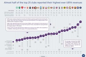 歐足聯獎金主要獎勵并反映賽季內的競技表現。前25名最高收入俱樂部均參加了2024/25賽季歐冠聯賽階段比賽。其中8家俱樂部歐戰(zhàn)收入超過1億歐元。利物浦是唯一未進入八強的球隊,但因聯賽階段位列頭名而獲得豐厚回報。25家球隊中12家俱樂部在本賽季歐足聯俱樂部賽事收入創(chuàng)歷史新高,得益于新賽制下分發(fā)金額的提升。