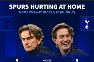 熱刺本賽季英超主場(chǎng)戰(zhàn)績1勝1平3負(fù),打進(jìn)5球丟掉5球,客場(chǎng)4勝1平保持不敗,打進(jìn)12球僅丟3球。