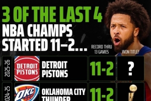 體育資訊11月17日訊 活塞媒體Pistons Talk曬出了一個驚人的巧合數(shù)據(jù),近4年的NBA總冠軍中,有三支球隊在當(dāng)賽季開局都是11勝2負(fù),唯有22-23賽季的掘金例外。