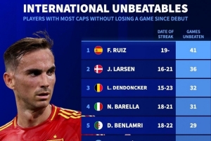 體育資訊11月20日訊 德國(guó)轉(zhuǎn)會(huì)市場(chǎng)統(tǒng)計(jì)了本世紀(jì)球員在國(guó)家隊(duì)的連續(xù)不敗場(chǎng)次數(shù)據(jù),并列出榜單,法比安·魯伊斯連續(xù)41場(chǎng)不敗居首。