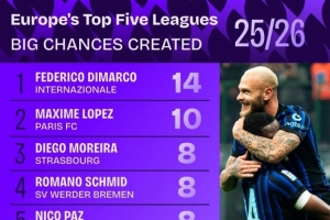 本賽季五大聯(lián)賽創(chuàng)造重大機(jī)會(huì)排名:
