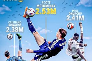 麥克托米奈倒鉤時(shí)的腳尖高度為2.53米,此前奧努阿楚的紀(jì)錄為2.41米,而C羅的紀(jì)錄為2.38米。
