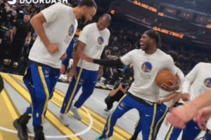 賽前,勇士眾將圍成一圈,庫(kù)里在中間翩翩起舞,妖嬈舞姿引得眾人大笑。