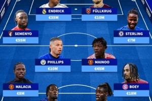中場(chǎng):塞梅尼奧(伯恩茅斯,5500萬(wàn))、卡爾文·菲利普斯(曼城,1000萬(wàn))、梅努(曼聯(lián),4500萬(wàn))、斯特林(切爾西,700萬(wàn))