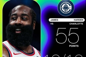 全場(chǎng)比賽,快船球星哈登出戰(zhàn)35分鐘,26中17,三分16中10得到55分3板7助攻1搶斷。