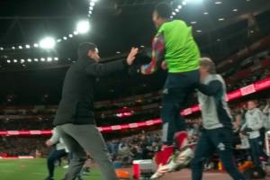 當(dāng)埃澤第76分鐘破門,上演帽子戲法幫助阿森納4-1領(lǐng)先熱刺時,原本在熱身的斯凱利沖向教練席高高躍起振臂歡呼,隨后他和阿爾特塔為首的教練組相擁慶祝,替補(bǔ)席上的多名隊(duì)員隨后也加入慶祝。