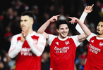阿森納隊(duì)球員賴斯(中)賽后慶祝勝利?! ⌒氯A社發(fā)主場以3比1戰(zhàn)勝本賽季狀態(tài)出色的拜仁慕尼黑隊(duì),阿森納隊(duì)豪取五連勝領(lǐng)跑歐冠聯(lián)賽積分榜,再加上英超賽場斬獲的九輪不敗,“槍手”無疑成為近來勢頭最盛的歐洲五大聯(lián)賽之師。