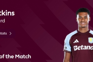 本場比賽沃特金斯梅開二度,成為球隊(duì)逆轉(zhuǎn)最大功臣,賽后他也當(dāng)選英超官方球迷票選全場最佳球員。