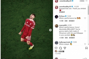 布拉德利當選本場比賽利物浦隊內最佳球員,賽后他在社交媒體上曬出照片,配文:“享受這場比賽,謝謝安菲爾德?!?/p>