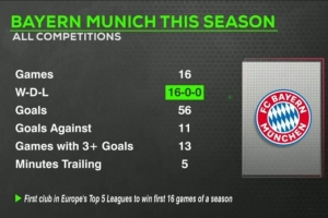 數(shù)據(jù)統(tǒng)計(jì)顯示,拜仁在本賽季各項(xiàng)賽事16戰(zhàn)保持全勝,打進(jìn)56球、丟11球。有13場比賽能夠至少打進(jìn)3球,本賽季共計(jì)僅有5分鐘處于落后。