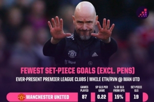 滕哈赫共率曼聯(lián)踢了87場英超比賽,通過定位球打進19球,平均每場0.22球,定位球進球占球隊總進球數(shù)僅為15%。本賽季,曼聯(lián)13輪英超比賽已經(jīng)通過定位球打進10球,和踢了14輪的阿森納持平。曼聯(lián)本賽季場均可通過定位球打進0.77球,定位球進球數(shù)占球隊總進球數(shù)的47.6%。