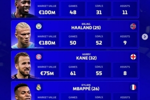 姆巴佩(皇馬,26歲,法國):身價1.8億歐,63場,62球,10助攻