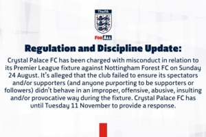 體育資訊11月5日訊 英足總發(fā)布官方公告,確認(rèn)水晶宮俱樂(lè)部因球迷行為不當(dāng)遭到指控,需要在11月11日之前做出回應(yīng)。