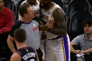 GIF-詹姆斯抓著裁判抱怨狄龍觸球