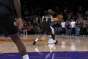 經(jīng)教練挑戰(zhàn)后回看復(fù)核,判定對(duì)布克的三分犯規(guī)吹罰無誤。布克在詹姆斯做出向上投籃動(dòng)作時(shí),主動(dòng)接觸其右臂/手腕部位。