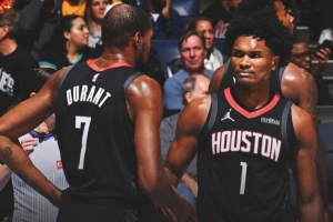 本場比賽,杜蘭特全場出戰(zhàn)34分半,18投5中,拿到11分4板5助1斷1帽,正負(fù)值+20;阿門打了38分鐘26投13中,三分3中1、罰球1中1拿到28分10籃板7助攻2搶斷,正負(fù)值+22。