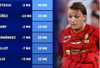 第一:雷特吉/胡拜爾庫(kù)迪西亞,4000萬(wàn)歐元(-500萬(wàn)),前意甲金靴,意大利歸化阿根廷的前鋒,當(dāng)打之年混沙特超。 第二:努涅斯/利雅得新月,3500萬(wàn)歐元(-1000萬(wàn)),前利物浦前鋒。 第三:迪亞比/吉達(dá)聯(lián)合,2800萬(wàn)歐(-200萬(wàn)),前阿斯頓維拉邊鋒。 并列第三:特奧/利雅得新月,2800萬(wàn)歐(-700萬(wàn)),前AC米蘭邊后衛(wèi)。 并列第三:米洛/吉達(dá)國(guó)民,2800萬(wàn)歐(-700萬(wàn)),前斯圖加特中場(chǎng),年紀(jì)輕輕混沙特超。 第六:菲利克斯/利雅得勝利,2500萬(wàn)歐元(+500萬(wàn)),葡萄牙金靴五大聯(lián)賽混不下,轉(zhuǎn)戰(zhàn)沙特超反而漲身價(jià)了。 并列第六:魯本-內(nèi)維斯/利雅得新月,2500萬(wàn)歐元(維持不變),葡萄牙國(guó)腳。 第八:羅杰-費(fèi)爾南德斯/吉達(dá)聯(lián)合,2200萬(wàn)歐元(維持不變),葡萄牙20歲新星。 并列第八:加來(lái)諾/吉達(dá)國(guó)民,2200萬(wàn)歐元(-200萬(wàn)),前波爾圖前鋒。 并列第八:科莫/利雅得勝利,2200萬(wàn)歐元(-800萬(wàn)),前拜仁邊鋒。