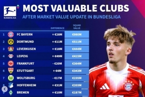 體育資訊12月19日訊 《轉(zhuǎn)會市場》在今日更新了德甲球員身價,也統(tǒng)計了德甲各隊的最新身價情況。