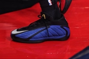 這雙球鞋采用外側(cè)藍(lán)色、內(nèi)側(cè)紅色的陰陽(yáng)配色,鞋后跟處則有堪薩斯大學(xué)的吉祥物。