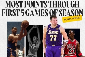 在賽季的前五場比賽中,東契奇合計(jì)得到200分,歷史第三高,僅次于張伯倫的兩次表演,詳情如下: