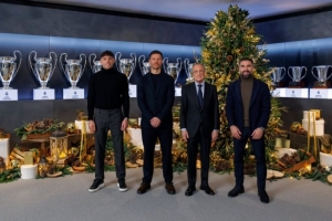 體育資訊12月25日訊 今日是西方傳統(tǒng)節(jié)日圣誕節(jié),皇馬官方社媒曬出皇馬主席弗洛倫蒂諾、主帥阿隆索和兩大隊長巴爾韋德、卡瓦哈爾的合照。