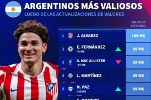 體育資訊12月27日訊 德國轉(zhuǎn)會(huì)市場(chǎng)更新了各大聯(lián)賽球員的身價(jià),并列出阿根廷球員身價(jià)排名,阿爾瓦雷斯1億歐居首。